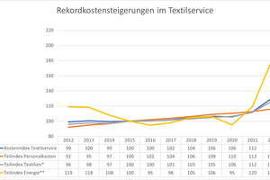 Berlin, 21.03.2023 – Das Jahr 2022 gehört zu den schwierigsten Jahren in der deutschen Wirtschaftsgeschichte. Pandemiefolgen, Krieg in der Ukraine, eine expansive Geldpolitik und gestörte Lieferketten führten zu sehr hohen Preis- und Kostensteigerungen für Wirtschaft und Gesellschaft. Der Kostenindex für den Textilservice stieg von 112 Punkten Ende 2021 auf 131 Punkte Ende 2022.